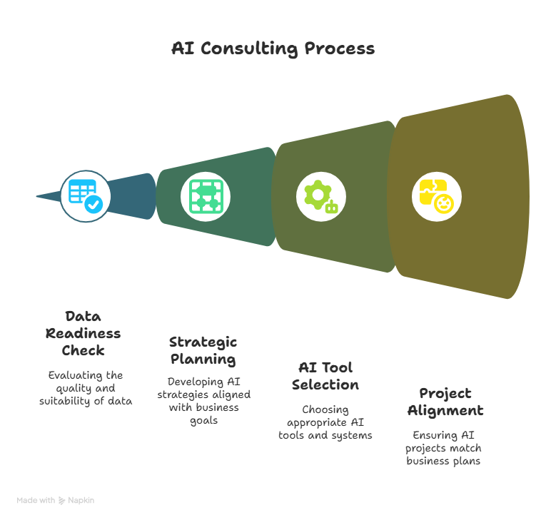 AI consulting means helping companies use artificial intelligence the right way. Consultants look at what your business needs, check if your data is ready, and make plans that match your goals.